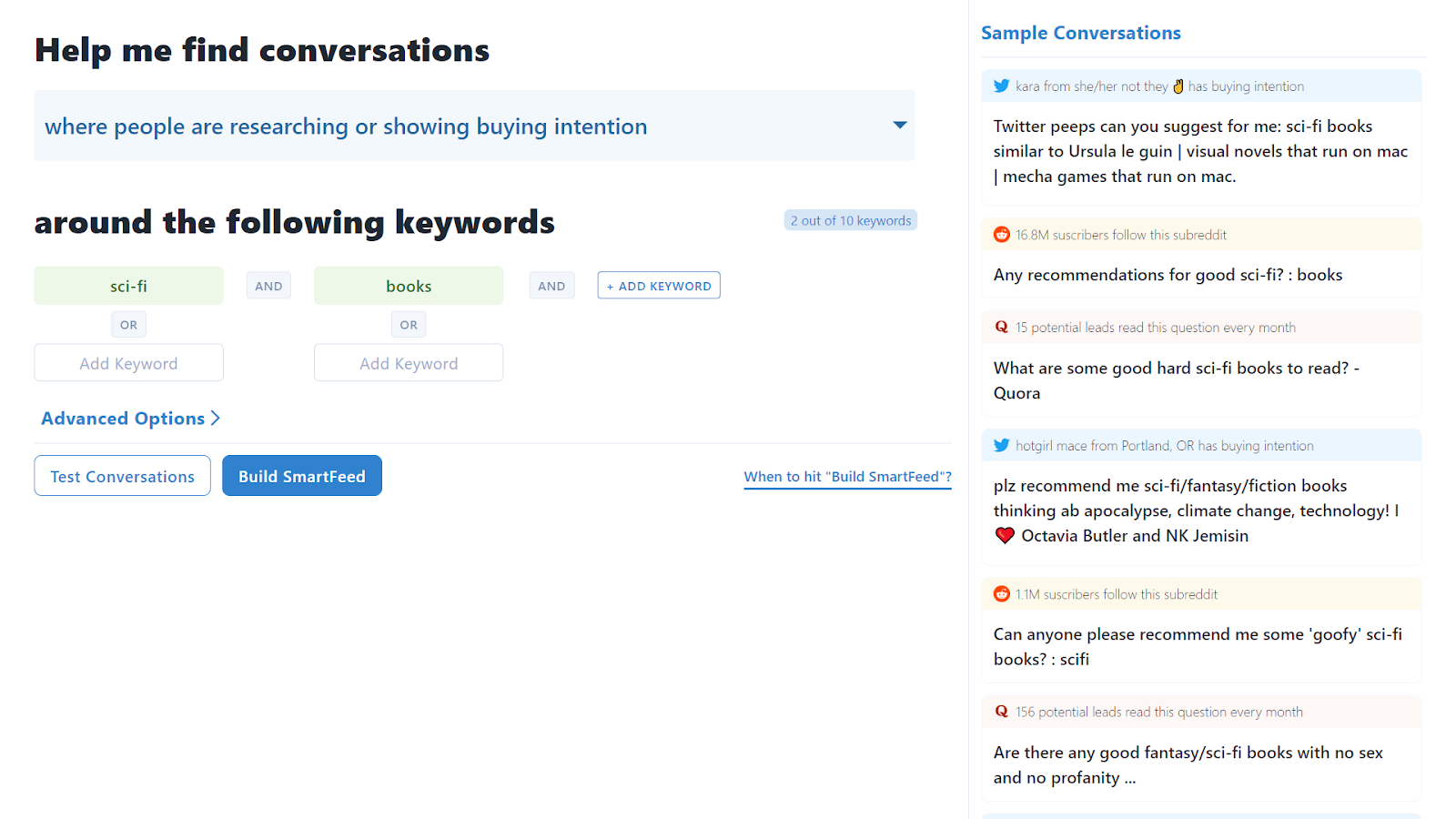 The next step is to build a SmartFeed. Once the SmartFeed is built, you get any conversation happening in the deepest pockets of web around the keywords with buying intention.